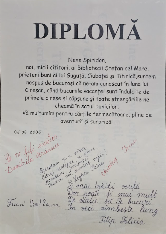 În anul 2006, scriitorul Spiridon Vangheli a primit o Diplomă de apreciere din partea micilor cititori ai Bibliotecii „Ștefan cel Mare”, în semn de recunoștință pentru cărțile sale îndrăgite și pentru bucuria pe care acestea o aduc copiilor.