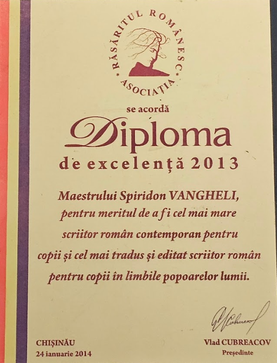Scriitorul Spiridon Vangheli, Maestru emerit al artei, a fost distins cu Diploma de Excelență 2013, acordată de Asociația „Răsăritul Românesc”, în semn de apreciere pentru meritele sale deosebite în literatura pentru copii.