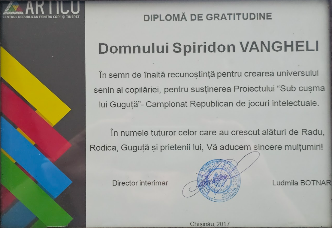 În anul 2017, scriitorul Spiridon Vangheli a fost distins cu Diploma de Gratitudine oferită de Centrul Republican pentru Copii și Tineret „ARTICO” din Chișinău.